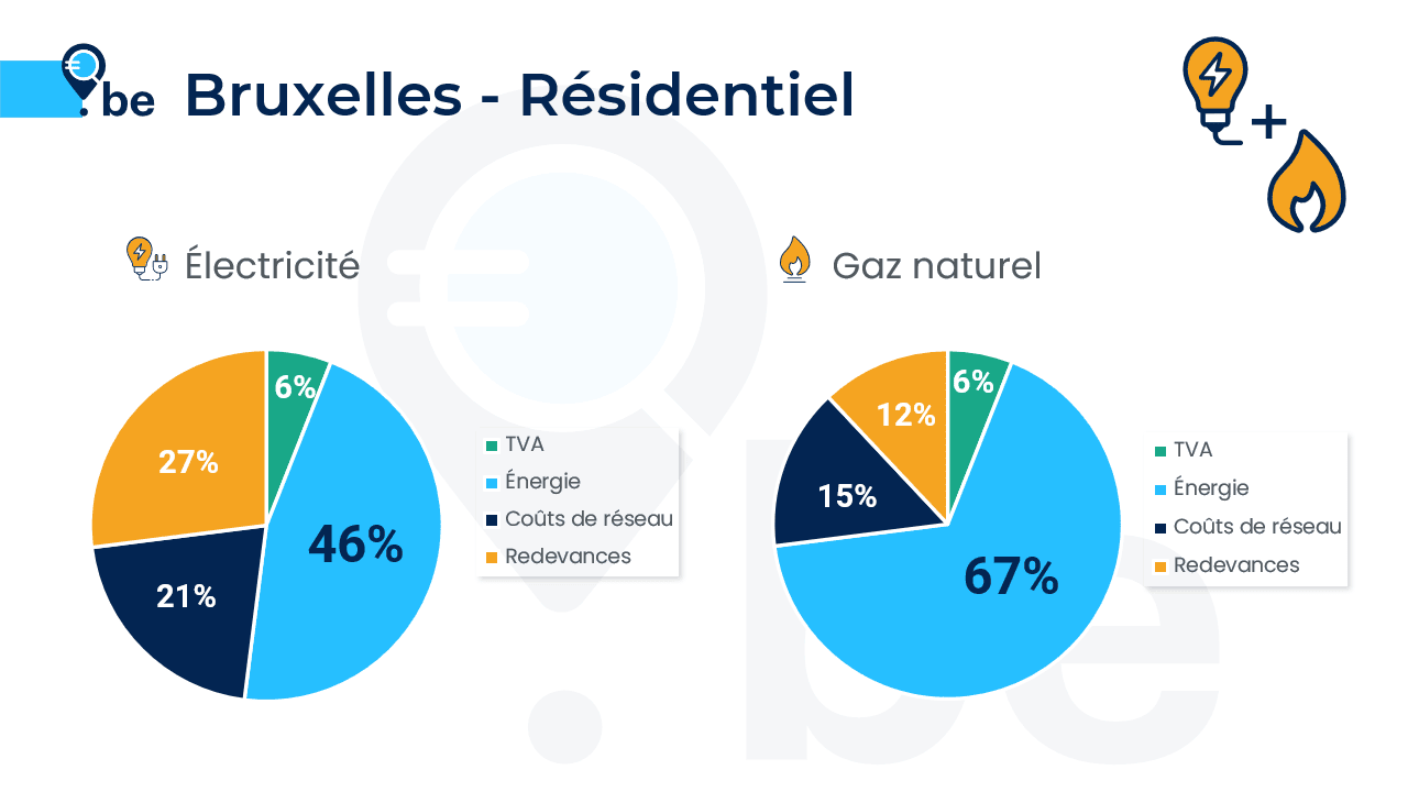 En mai 2023 en Wallonie, les postes « redevances » et « TVA » de votre facture s’élevaient ensemble à 32 % pour l’électricité et à 21 % pour le gaz. À Bruxelles, on atteignait 33 % pour l’électricité et 18 % pour le gaz.