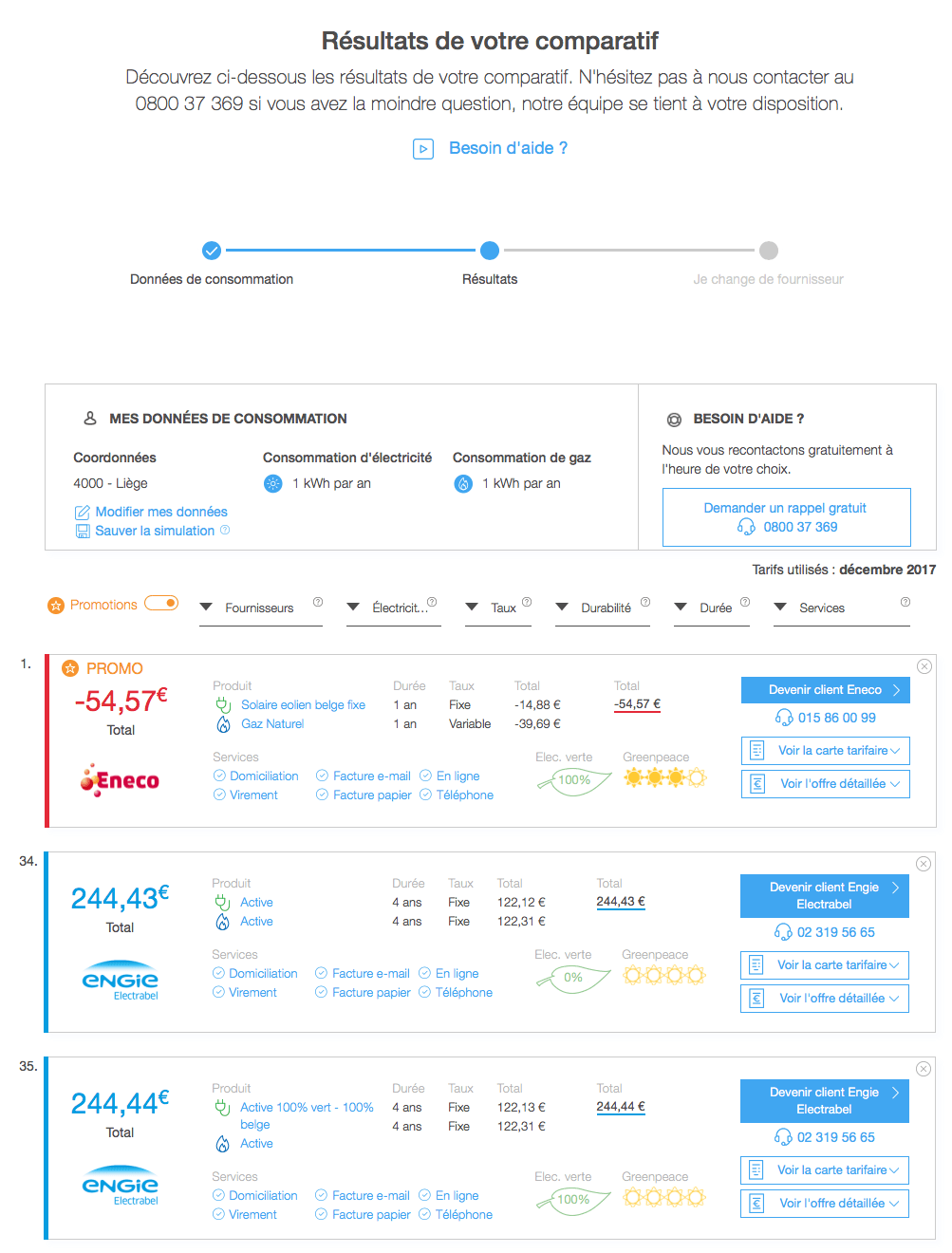Prenons un exemple concret. D’après notre analyse, il existe une différence de 300 euros entre le contrat le plus adapté et celui le moins adapté dans ce genre de situation. Les critères de référence repris pour arriver à ce résultat sont les suivants : 1 kWh pour l’électricité et 1 kWh pour le gaz sur le code postal 4000.