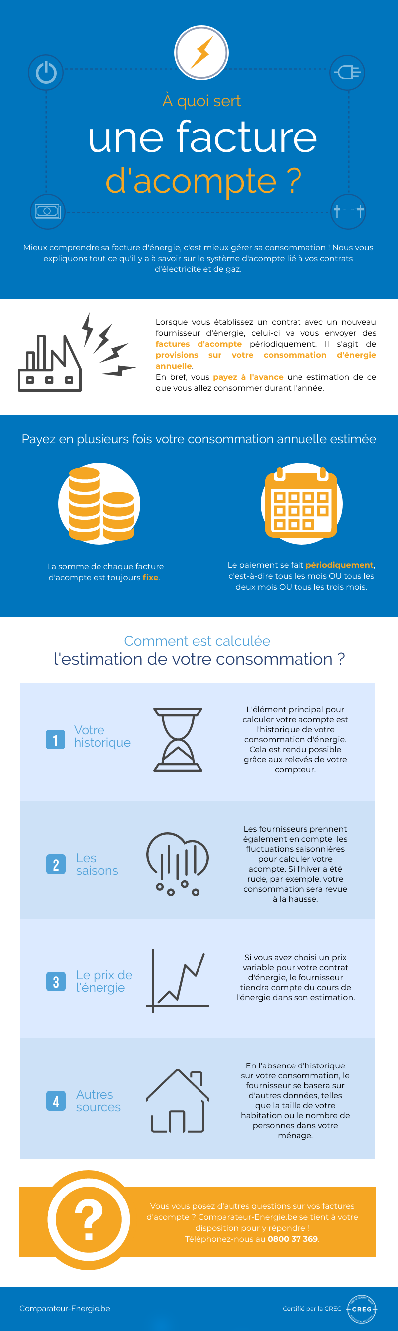 Lorsque vous établissez un contrat avec un nouveau fournisseur d’énergie, celui-ci vous envoie le plus souvent des factures d’acompte périodiquement. Il s’agit de provisions sur votre consommation d’énergie annuelle. En d’autres termes, vous payez à l’avance une estimation de ce que vous allez consommer durant l’année.