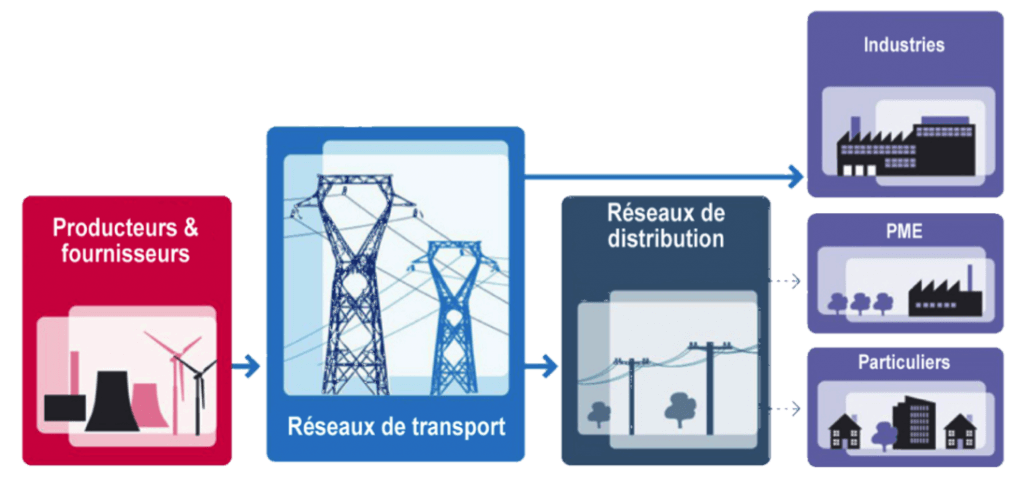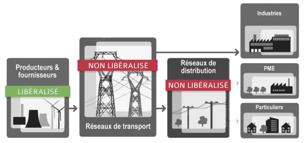 La libéralisation a eu pour effet de supprimer les responsabilités de certains acteurs actifs sur le marché de l’énergie et de les redistribuer à d’autres. Dans la pratique, les entreprises présentes à différents niveaux ont été sommées de séparer leurs activités afin de ne pas fausser le jeu de la concurrence. Cette obligation a dès lors donné naissance à plusieurs types d’acteurs. Aujourd’hui, le processus d’acheminement de l’énergie est clairement divisé entre chacun d’entre eux.