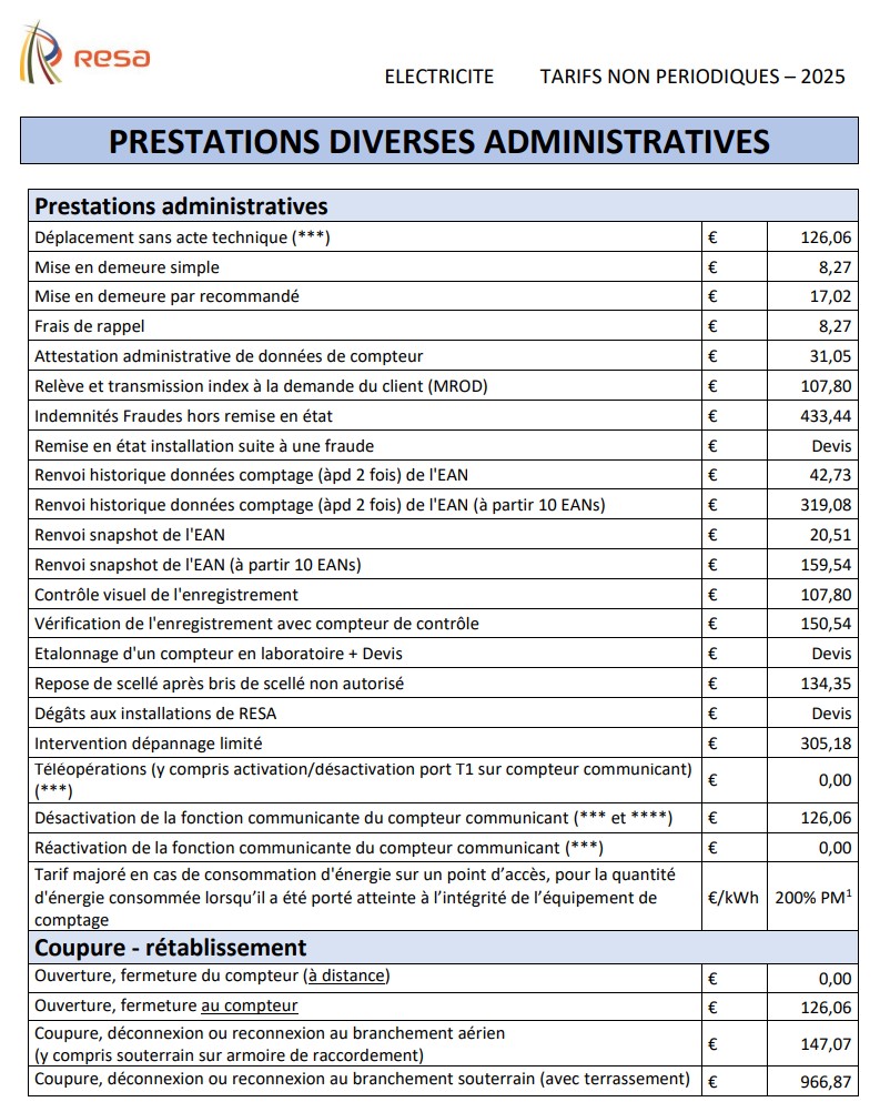 L’ouverture et la fermeture à distance d’un compteur communicant chez RESA sont gratuites. En revanche, l’ouverture et la fermeture d’un compteur analogique sont payantes. Les tarifs peuvent varier d’une année à l’autre (électricité et gaz).