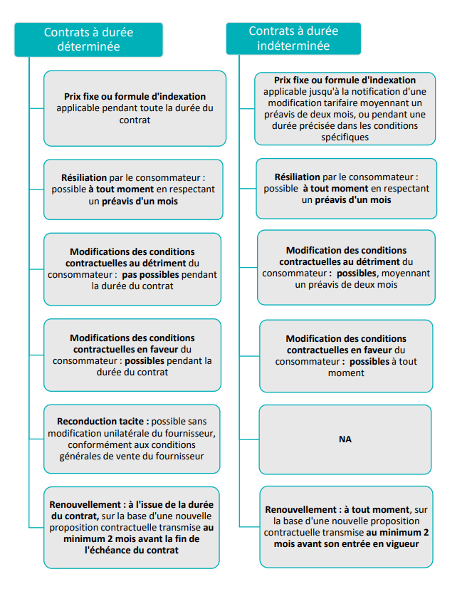Le saviez-vous ? Un CDD signifie que les conditions pour lesquelles vous avez signé (par exemple : une formule fixe ou variable) sont applicables durant toute la durée de votre contrat sans changement possible de la part de votre fournisseur, sauf en faveur du consommateur. Un CDI signifie que les conditions vous avez souscrites sont passible de changement par votre fournisseur si ce dernier respecte un délai de préavis.