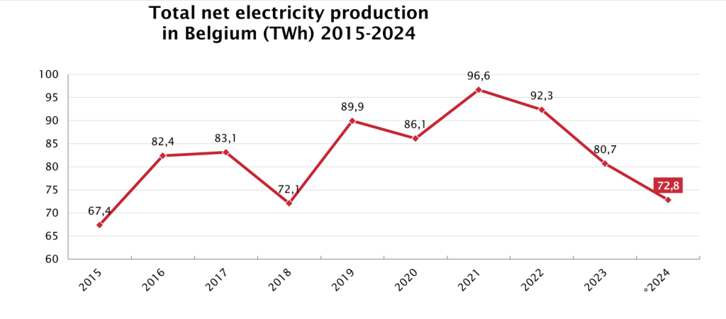 - Entre 2022 et 2024, Doel 3 et Tihange 2 ferment leurs portes et la Belgique connait d’autres problèmes avec les centrales nucléaires. Résultat ? La production nationale d’électricité chute.